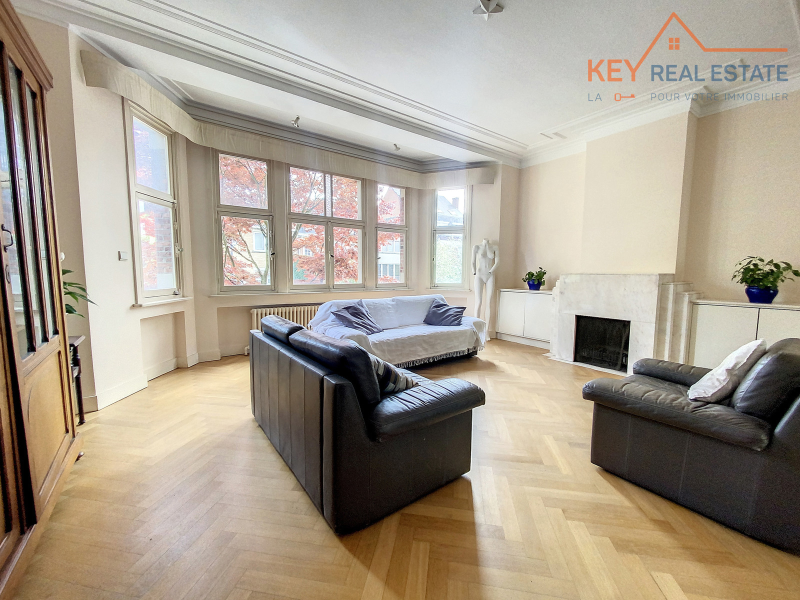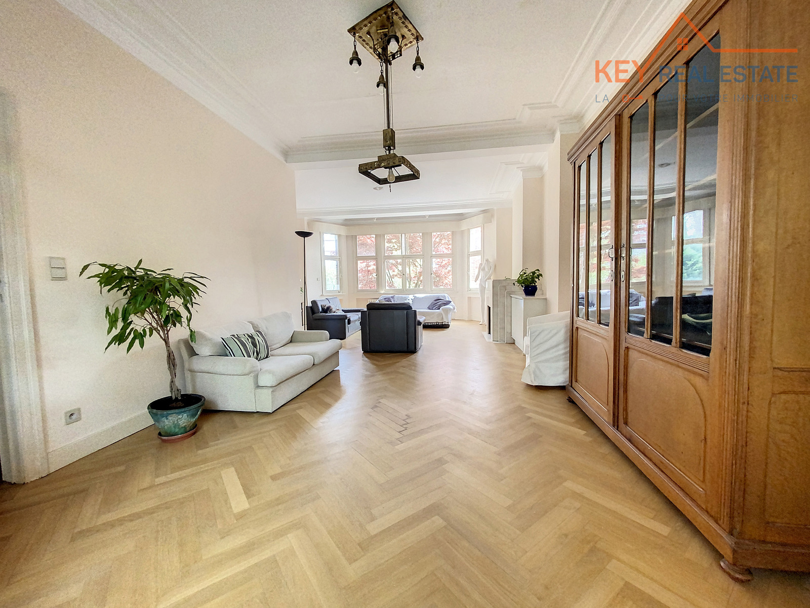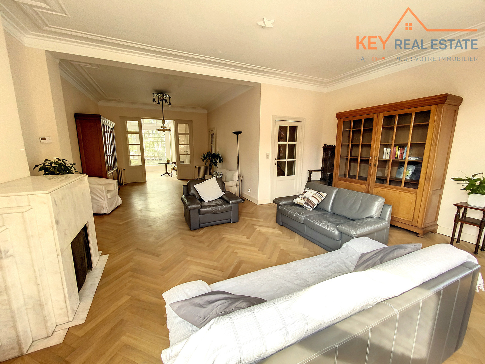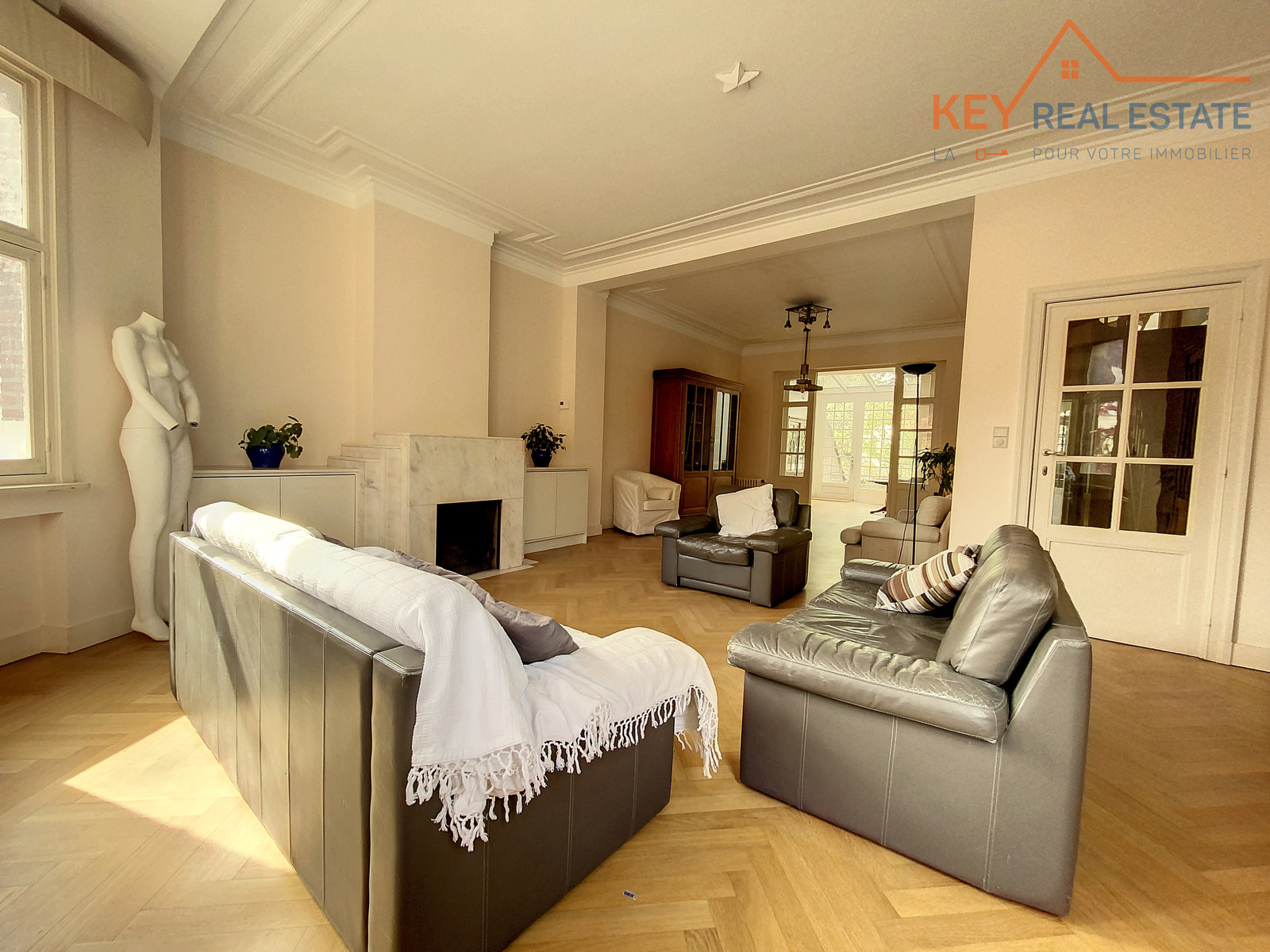 (Quartier Saint-Michel) Située dans un quartier chic et recherché à proximité du Square Montgomery – du Parc de Woluwe – des écoles (Collège Saint-Michel, Athénée Royale, et Ecole Européenne) – et des institutions européennes, à distance de marche des stations de métro Petillon et Thieffry, superbe maison de maître de style Art-Déco datant de 1931 et signée par l’architecte Fernand Lippens. Sise sur un terrain bien orienté (Sud Ouest) de +/-1a70ca, elle offre une superficie brute selon PEB de 279m². Elle se compose de vastes réceptions +/-55m² avec feu ouvert, cuisine équipée, 6 chambres (dont une Master avec salle de bains attenante), bureau au RDCH, 2 salles de douche et 2 salles de bains, buanderie, grandes caves, et garage. Cette superbe maison pourrait également accueillir une profession libérale au rez-de-chaussée et convient parfaitement bien pour une grande famille grâce, entre autre, à ses 3 chambres et salle de bains au 3ème étage. Agréable jardin et grande terrasse au dernier étage exposés Sud Ouest. La maison est très bien entretenue mais à remettre au goût du jour! Magnifiques prestations!! Informations et visites 7J/7: www.keyrealestate.be – 0477/656782.