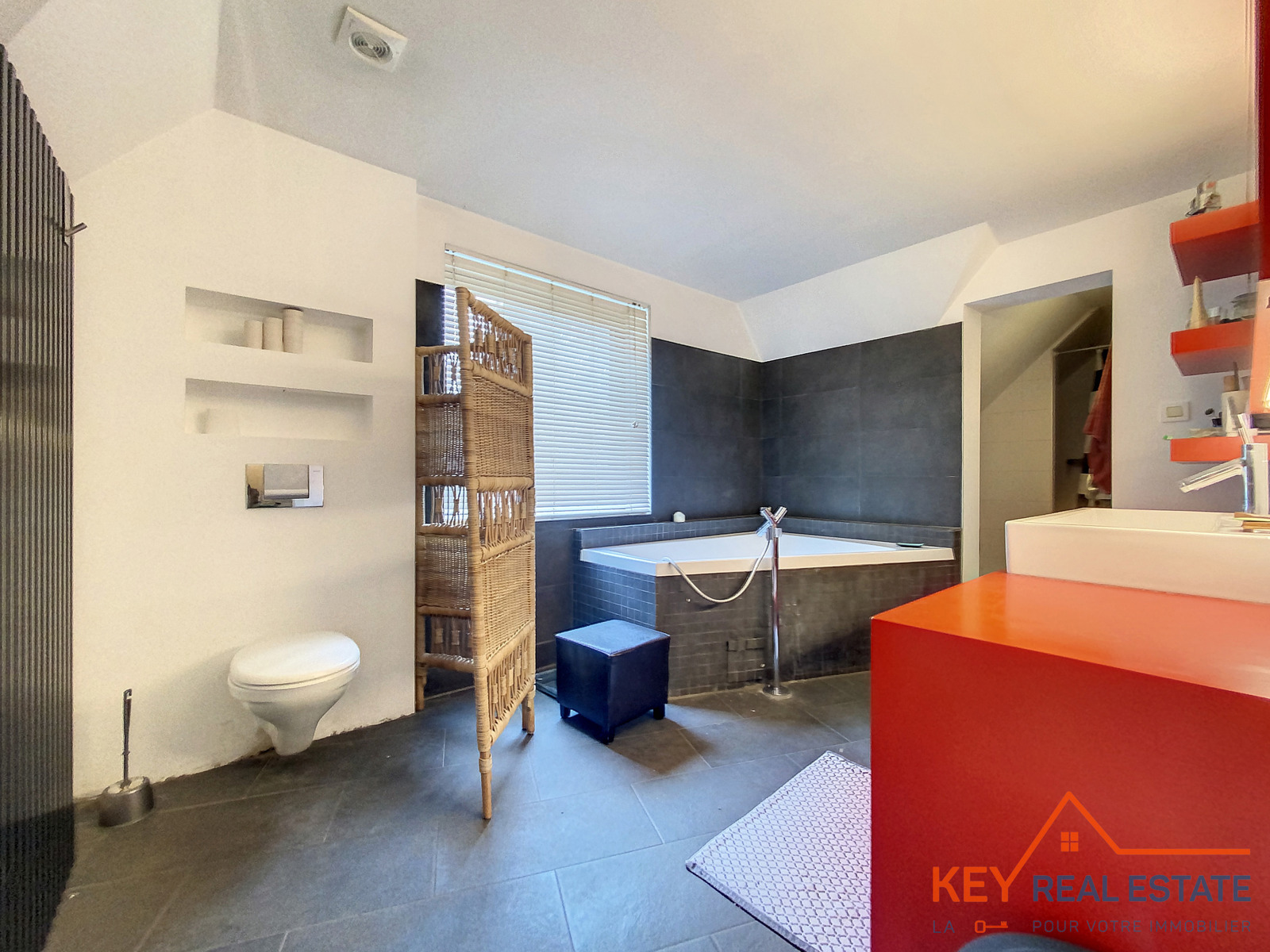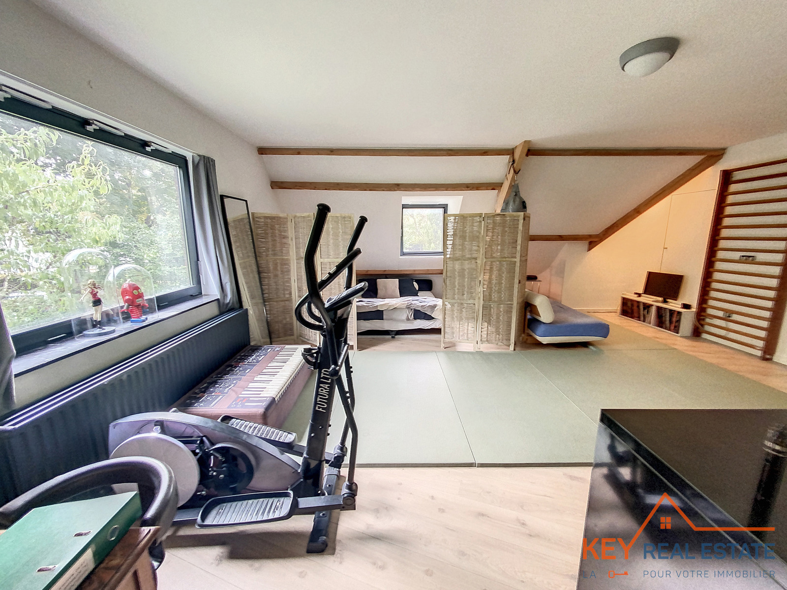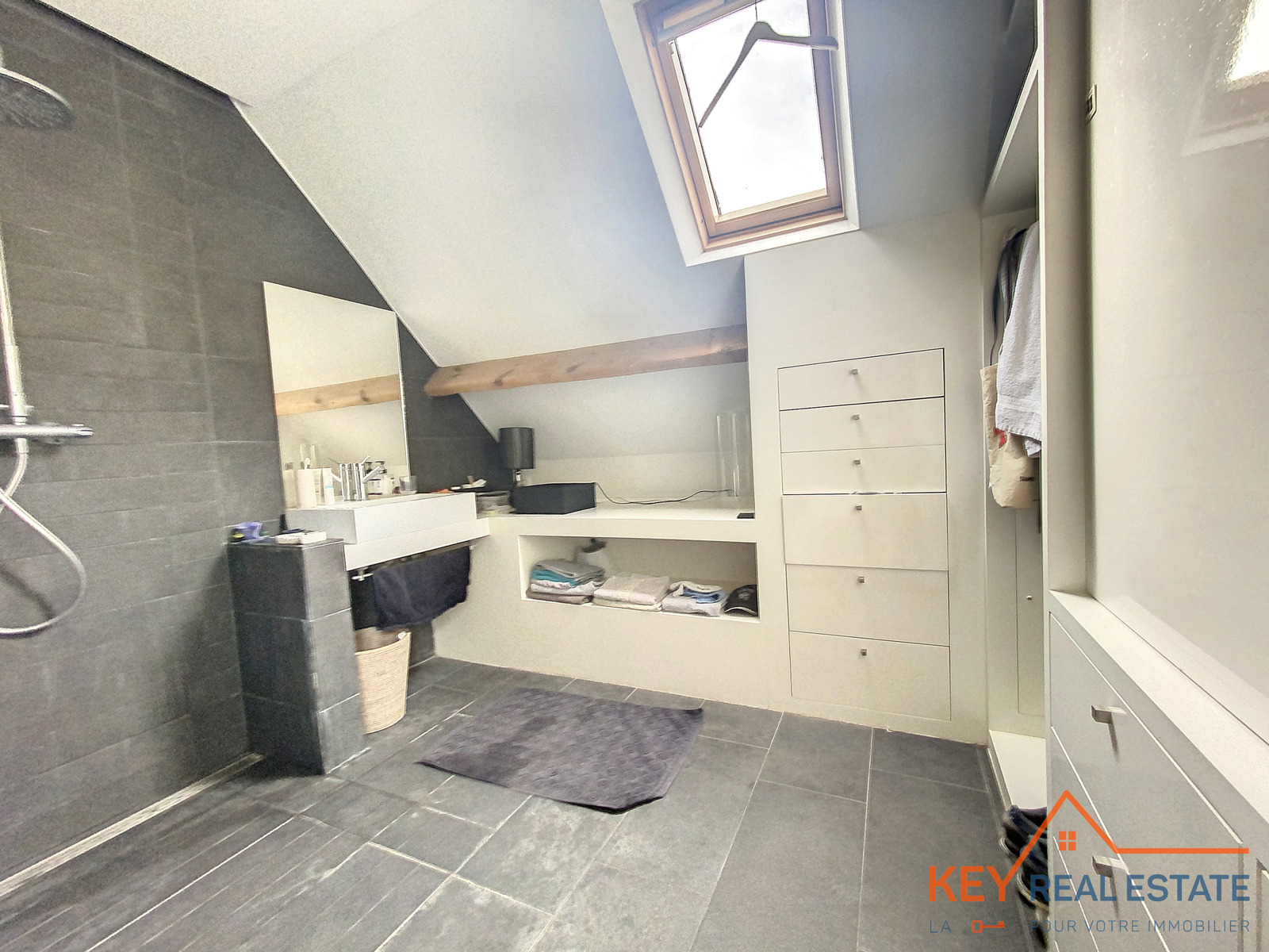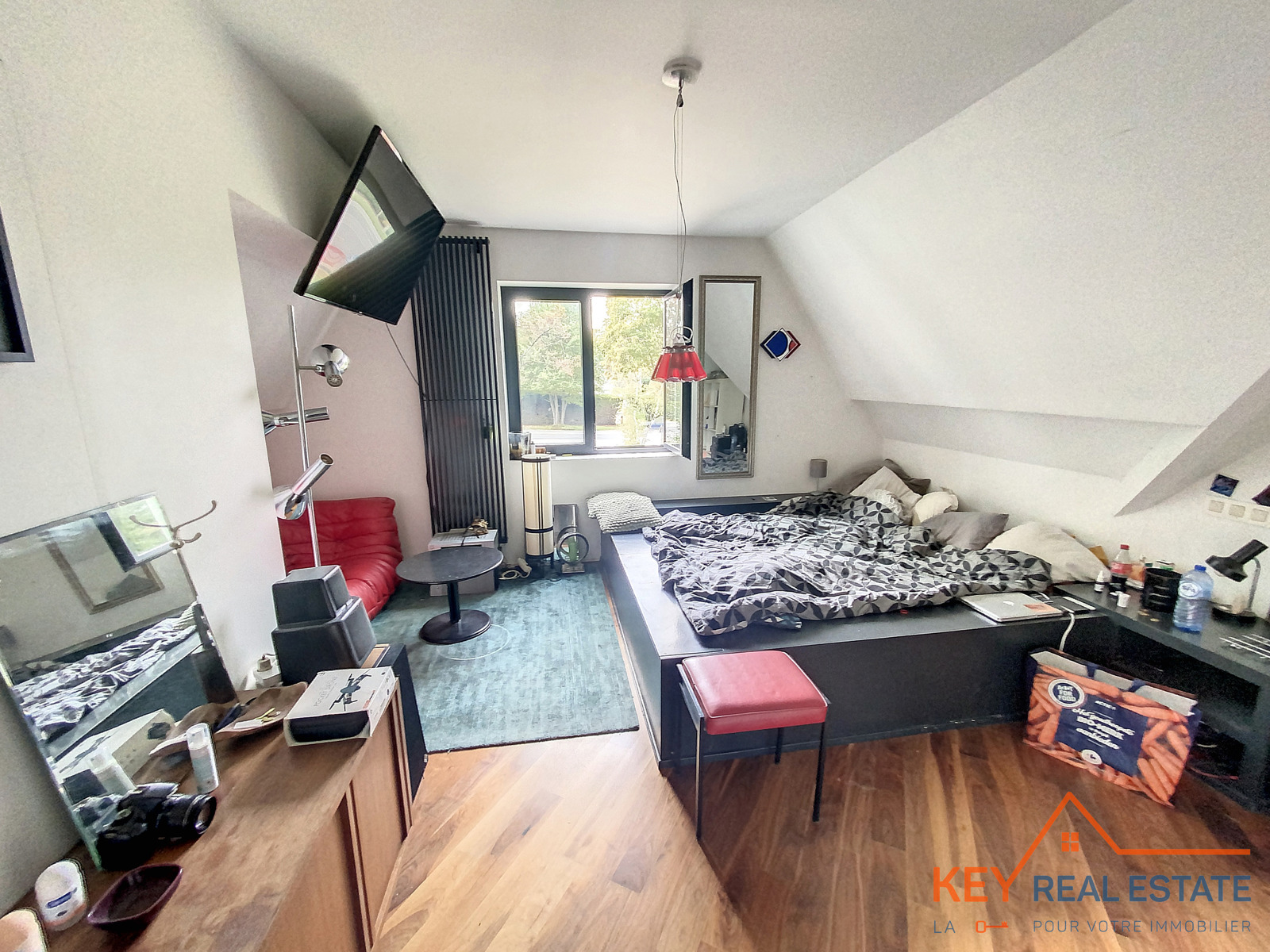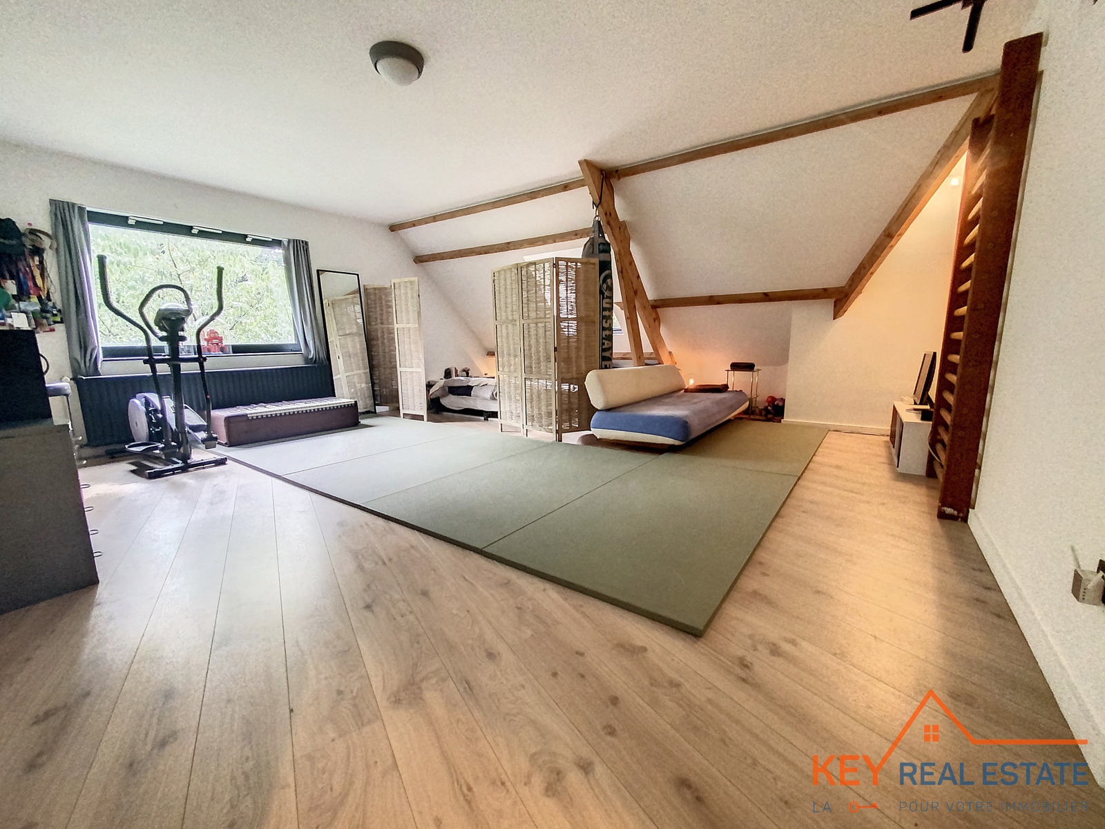 Rhode-Saint-Genèse (limite Waterloo) – Située dans le quartier prisé du Manoir, grande villa atypique bénéficiant d’une surface utile brute selon PEB de 465m² (+/-340m² habitables) implantée sur un magnifique terrain joliment arboré de 15a32ca. La villa s’étend sur 4 niveaux et se compose comme suit: au RDCH – hall d’entrée avec vestiaire et toilette visiteur, vaste séjour avec insert au bois et de grandes baies vitrées donnant accès aux terrasses sans vis-à-vis et avec une grande cheminée d’extérieur, cuisine à rénover, remise/office, et un garage une voiture. Le rez-de-jardin conviendra parfaitement bien pour l’exercice d’une profession libérale étant également accessible par une entrée séparée à l’arrière de la villa mais pourrait également convenir pour du logement. Cet espace d’environ 85m² (plus cave, wc et buanderie) se compose de 3 bureaux (ou 3CH) avec isolation phonique et traitement acoustique ainsi qu’une grande pièce commune de +/-33m² très conviviale côté jardin. Au 1er étage: hall de nuit avec accès vers le grenier aménagé, une suite parentale de +/-44m² (poss. de la scinder en 2) avec sa grande SDB attenante, 1CH de +/-15m² avec SDD en-suite, et 1CH de +/-19m² plus dressing. La grand SDB est aussi accessible par le hall de nuit. Au 2ème étage: grenier aménagé. Le bien dispose également d’un carport ainsi que de nombreuses places de PKG à l’avant et à l’arrière de la maison. Prévoir les modernisations habituelles : cuisine, menuiserie intérieure et extérieure, une petite partie des châssis, … Venez découvrir le beau potentiel qu’offre cette villa atypique!! Annonce et indications non contractuelles, sous réserve de modification. Informations et visites 7J/7: www.keyrealestate.be – 0477/656782.